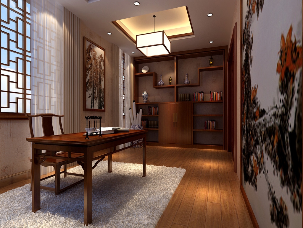 中式風(fēng)格的書房,符合典雅、樸實、具有傳統(tǒng)意義上的“書齋”的韻味。“斯是陋室,唯吾獨馨”就是中式風(fēng)格書房的完美演繹。紅色仿木紋樣式的吊頂,置入中式家具,加上中式書柜、茶幾及屏風(fēng),配以中國字畫和古玩等點綴其間,就構(gòu)成一幅中式風(fēng)格的書房藍(lán)圖。進(jìn)入這個書房學(xué)習(xí),你是不是也會有種穿越的感覺。