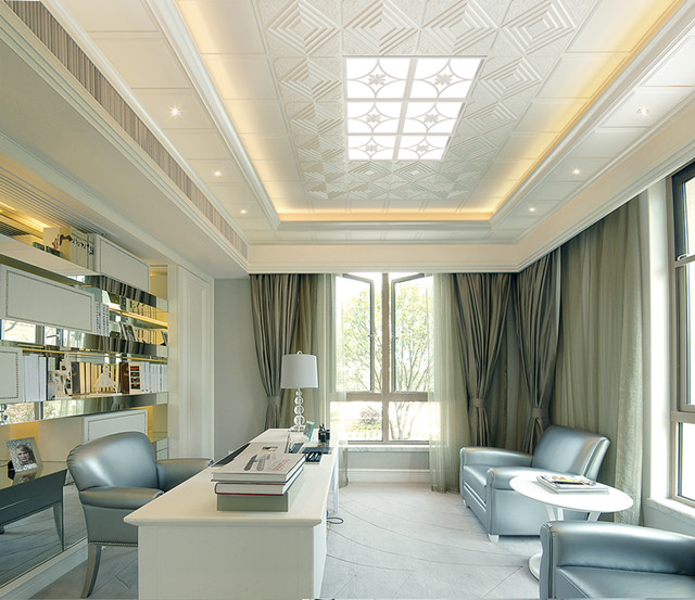 簡約美式風(fēng)格的書房,簡潔明了,室內(nèi)采用一色的灰白樣式,吊頂采用橫木樣式的,邊上裝上幾個小筒燈,使之書房增加明亮度。采用抽象繪畫和雕塑來裝飾,打破一些乏味、單調(diào)、生硬的線條,以期獲得完美豐富的空間感受。在這樣的書房,你的思緒是不是也會多一點呢?