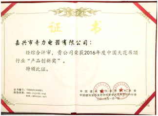 嘉興市奇力電器有限公司做為吊頂行業(yè)公認的“十大品牌”和中國建筑裝飾裝修材料協會天花吊頂材料分會常務副會長單位,應邀參加了這次盛會。公司憑借優(yōu)異的研發(fā)團隊和在吊頂產品創(chuàng)新中取得的不俗成績,榮獲2016年度中國天花吊頂行業(yè)“產品創(chuàng)新獎”。